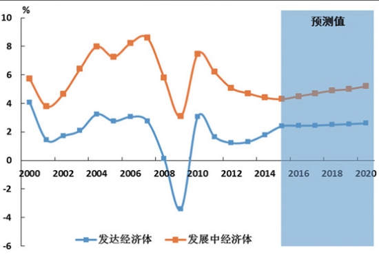 圖1 世界經(jīng)濟(jì)增速 發(fā)展中經(jīng)濟(jì)體地位繼續(xù)提升,經(jīng)濟(jì)增長的引擎回歸發(fā)達(dá)經(jīng)濟(jì)體。2000-2007年發(fā)展中經(jīng)濟(jì)體年均增速為6.7%,高于世界平均增速2.3個(gè)百分點(diǎn)。受到金融危機(jī)沖擊,發(fā)達(dá)經(jīng)濟(jì)體出現(xiàn)大幅度的下滑(如圖2所示),歐美日經(jīng)濟(jì)同時(shí)面臨巨大沖擊甚至出現(xiàn)萎縮,發(fā)展中經(jīng)濟(jì)體雖然經(jīng)濟(jì)增速有所下降,但明顯好于發(fā)達(dá)經(jīng)濟(jì)體,發(fā)展中經(jīng)濟(jì)體特別是中國一度扮演了世界經(jīng)濟(jì)增長引擎的角色。依托技術(shù)優(yōu)勢,發(fā)達(dá)經(jīng)濟(jì)體增速呈現(xiàn)回升態(tài)勢,而發(fā)展中經(jīng)濟(jì)體增速將有所放緩,與世界經(jīng)濟(jì)平均增速差異明顯縮小到1.1個(gè)百分點(diǎn)。預(yù)計(jì)“十三五”期發(fā)達(dá)經(jīng)濟(jì)體的年均增速為2.5%,發(fā)展中經(jīng)濟(jì)體為4.9%(如圖2所示)。按照對世界經(jīng)濟(jì)增長的絕對凈貢獻(xiàn)來計(jì)算,經(jīng)濟(jì)增長引擎開始回歸到發(fā)達(dá)經(jīng)濟(jì)體,這意味著相對于集裝箱而言,大宗貨物海運(yùn)需求減緩將更加明顯。