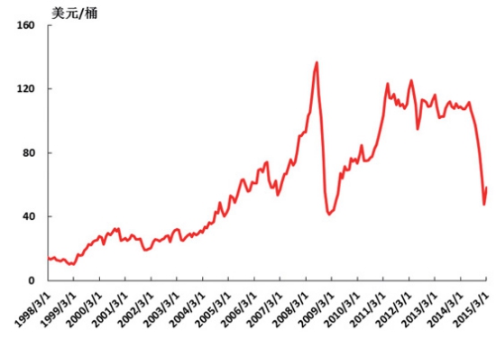 圖2 發(fā)達(dá)經(jīng)濟(jì)體與發(fā)展中經(jīng)濟(jì)體增速 2. 資源類大宗商品供需關(guān)系轉(zhuǎn)換,商品價(jià)格相對低位。 大宗資源類價(jià)格進(jìn)入一輪低谷。在上一輪世界經(jīng)濟(jì)快速增長的帶動(dòng)下,對石油、鐵礦石等資源類商品需求快速增長,天平向供給方傾斜,推動(dòng)了資源價(jià)格大幅度上漲(如圖3和圖4所示),同時(shí)也刺激資本對資源開發(fā)、生產(chǎn)投入大幅度增長。在世界經(jīng)濟(jì)增速放緩、生產(chǎn)率效率持續(xù)提高和日益注重節(jié)能減排的背景下,需求減弱,而產(chǎn)出穩(wěn)定增長,供需關(guān)系出現(xiàn)了失衡,天平向需求方傾斜,資源價(jià)格開始大幅下跌。石油價(jià)格一度跌至40多美元,中國鐵礦石到岸價(jià)也跌至60-70美元的水平(如圖3和圖4所示)。從多個(gè)機(jī)構(gòu)的預(yù)測來看,今后一個(gè)時(shí)期大宗商品價(jià)格很難有大幅提升。