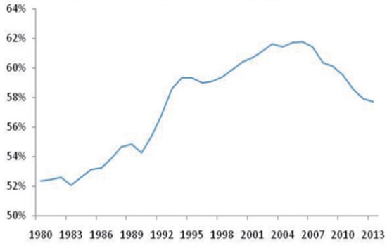 圖6 三大產(chǎn)業(yè)占規(guī)模經(jīng)濟(jì)比重變化 區(qū)域協(xié)調(diào)發(fā)展,沿海地區(qū)占經(jīng)濟(jì)比重下降。隨著西部開發(fā)、中部崛起戰(zhàn)略的實(shí)施,中西部地區(qū)逐步扭轉(zhuǎn)了經(jīng)濟(jì)增速長期低于沿海地區(qū)的態(tài)勢,2004年后在經(jīng)濟(jì)總量中所占比重逐步上升。根據(jù)國家全面建成小康社會(huì)目標(biāo),在長江經(jīng)濟(jì)帶、“一帶一路”和京津冀協(xié)同發(fā)展國家戰(zhàn)略的推動(dòng)下,東部沿海經(jīng)濟(jì)最發(fā)達(dá)地區(qū)將保持穩(wěn)定增長,但所占GDP比重呈現(xiàn)下降態(tài)勢(如圖7所示),各區(qū)域間的經(jīng)濟(jì)發(fā)展水平在趨于均衡。