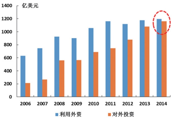 圖8 我國外貿(mào)進(jìn)出口總額增速變化 3.對外投資快速增長,“引進(jìn)來”與“走出去”并重。 我國將實(shí)現(xiàn)由利用外資為主逐步轉(zhuǎn)向利用外資與對外投資并重得格局轉(zhuǎn)換。改革開放初期,由于經(jīng)濟(jì)社會(huì)發(fā)展水平較低,發(fā)展面臨資金短缺的壓力,形成了我國以引進(jìn)外資為主的格局。隨著我國經(jīng)濟(jì)發(fā)展、進(jìn)入中高收入國家行列和成為世界外匯儲(chǔ)備最多的國家,在繼續(xù)注重利用外資的同時(shí),也逐步擴(kuò)大對外投資,對外投資流量已居世界第三,吸引外資和對外投資都達(dá)到1000億美元規(guī)模,兩者基本均衡(如圖9所示)。從我國“走出去”的重點(diǎn)行業(yè)來看,主要集中于采礦業(yè)、制造業(yè)、服務(wù)業(yè)、高科技行業(yè)和優(yōu)勢農(nóng)業(yè)。預(yù)計(jì)“十三五”期間對外投資將保持1000億美元,“走出去”發(fā)展將使我國海運(yùn)需求由原來的放射結(jié)構(gòu),轉(zhuǎn)向全球網(wǎng)絡(luò)化結(jié)構(gòu);同時(shí)針對“走出去”面臨各種風(fēng)險(xiǎn),要求海運(yùn)在應(yīng)對突發(fā)事件中更好地發(fā)揮支持保障作用。