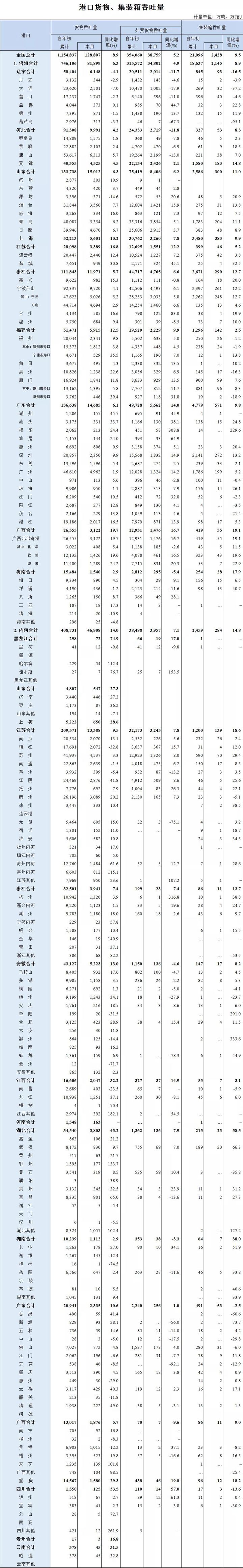 根據(jù)交通運(yùn)輸部數(shù)據(jù),1-9月,全國(guó)港口完成貨物吞吐量115.48億噸,同比增長(zhǎng)8.9%;完成集裝箱吞吐量2.11億TEU,同比增長(zhǎng)9.5%。其中,沿海港口完成貨物吞吐量74.6億噸,同比增長(zhǎng)6.3%;完成集裝箱吞吐量1.86億TEU,同比增長(zhǎng)8.9%。 9月份,兩大榜單排名未見(jiàn)變化,只是增速進(jìn)一步放緩,集裝箱吞吐量方面東莞港已與去年持平,福州港吞吐量增速轉(zhuǎn)為負(fù)數(shù),不過(guò)從總體來(lái)看,集裝箱吞吐量與貨物吞吐量的增速降幅不大,已進(jìn)入平穩(wěn)增長(zhǎng)區(qū)間。從海關(guān)數(shù)據(jù)來(lái)看,9月份當(dāng)月進(jìn)出口同比增長(zhǎng)15.4%,增速較8月份回落了3.5個(gè)百分點(diǎn)。 港口圈認(rèn)為,這不意味著港口總體向好的發(fā)展趨勢(shì)就此打住,9月份,臺(tái)風(fēng)對(duì)長(zhǎng)三角、東南沿海、珠三角各大港口生產(chǎn)運(yùn)輸都有影響,限電也波及各制造業(yè)大省,可能導(dǎo)致出口貨物減少。但這些因素的陰霾不會(huì)持續(xù)太久,在國(guó)家力保煤電供應(yīng)的政策下,第四季度港口生產(chǎn)數(shù)據(jù)仍將保持相對(duì)穩(wěn)定的增長(zhǎng)。 附交通運(yùn)輸部完整數(shù)據(jù):