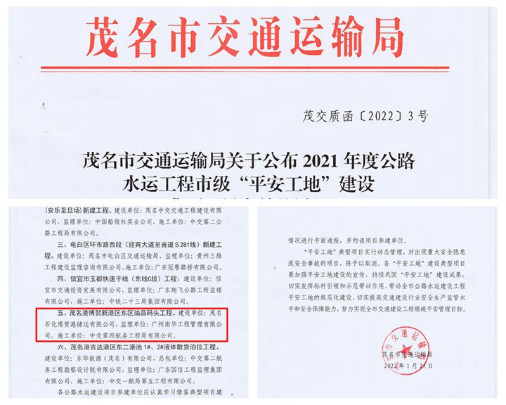 近日,茂名市交通運(yùn)輸局在全市公路水運(yùn)項(xiàng)目中部署開(kāi)展平安工地建設(shè)考核工作。經(jīng)過(guò)層層遴選,茂名港博賀新港區(qū)東區(qū)油品碼頭工程再次被評(píng)為市級(jí)“平安工地”建設(shè)典型項(xiàng)目,連續(xù)兩年榮獲“平安工地”稱號(hào)!